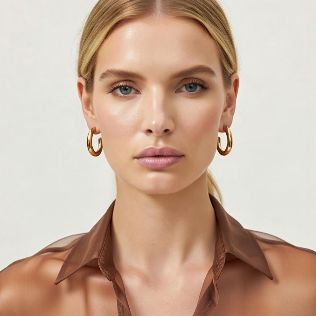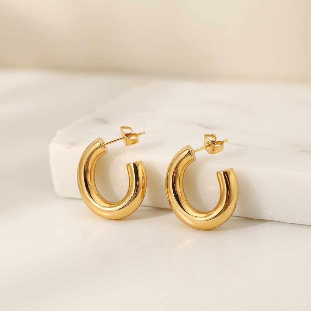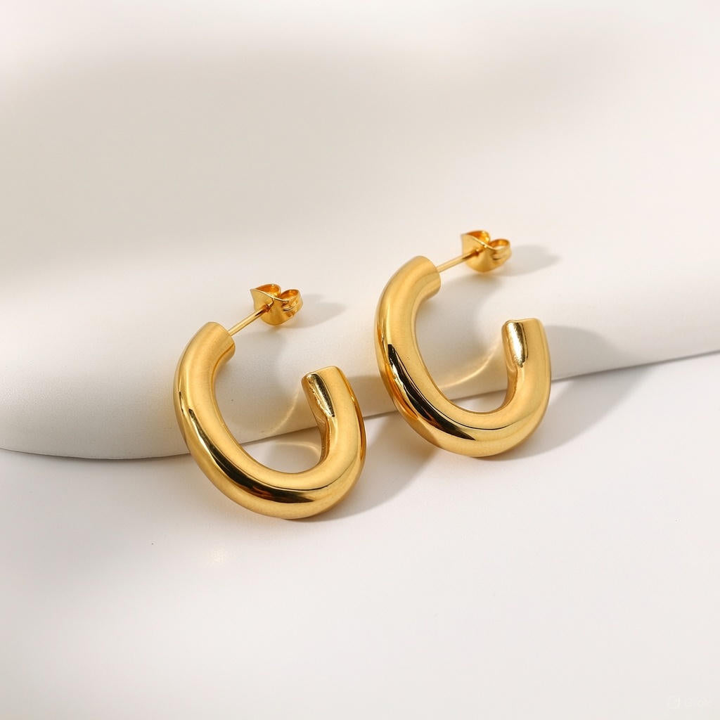 Acrescente um toque moderno e sofisticado ao seu visual com estes brincos em aço inoxidável banhados a ouro 18K. O seu design em formato C, de inspiração geométrica e estilo ins, torna-os numa peça elegante e versátil, perfeita para o uso diário ou para ocasiões especiais.