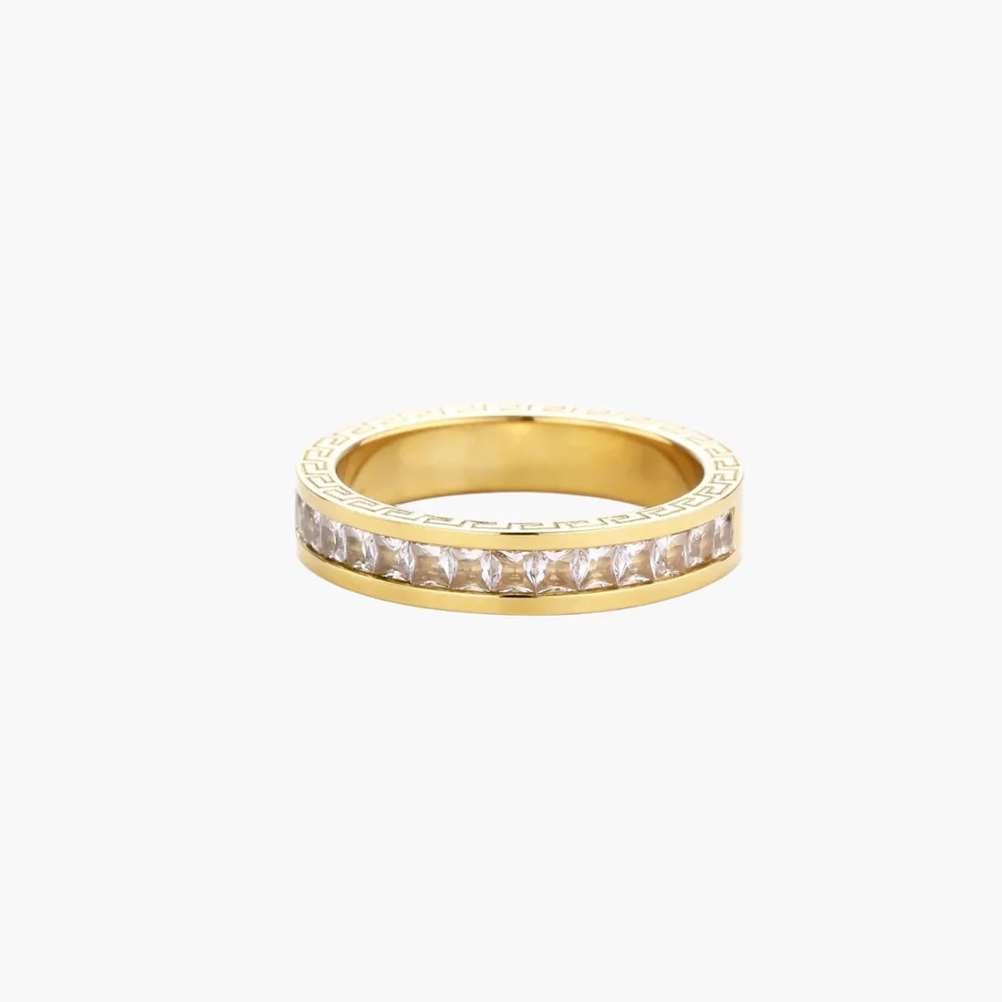 O motivo da chave grega antiga encontra o brilho moderno neste anel banhado a ouro de 14 quilates que transmite confiança e calor. As zircónias cravejadas em canal captam a luz de todos os ângulos, tornando-o a peça perfeita para inaugurações de galerias ou para conquistar aquela promoção durante as reuniões de segunda-feira de manhã.