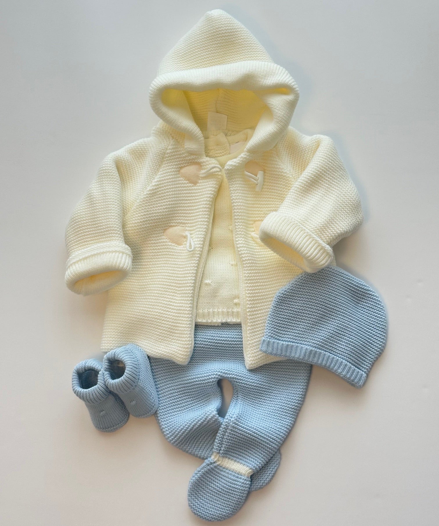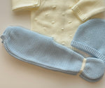 Este conjunto em malha de 3 peças para bebé é a escolha ideal para proporcionar conforto, suavidade e proteção ao seu pequeno nos dias mais frescos. Produzido em malha de alta qualidade, inclui uma camisola de manga comprida com botões, umas calças aconchegantes e um gorro a condizer. O design clássico e intemporal torna-o perfeito tanto para o uso diário como para ocasiões especiais, sendo também uma excelente opção para presente.