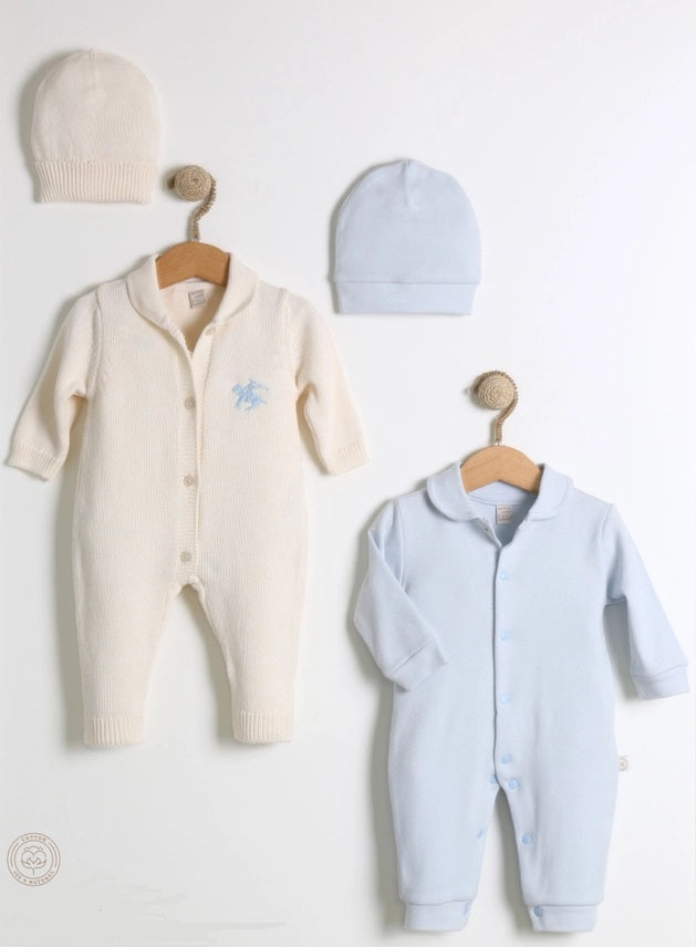 Um conjunto de 4 peças feito de puro algodão orgânico consiste num macacão azul claro ou rosa com encaixes na frente. Há também um chapéu da mesma cor. Este conjunto inclui ainda um macacão de malha, que é em creme e tem um motivo azul ou rosa no peito. Há também um chapéu de malha na cor e padrão do macacão. Este conjunto está disponível em várias cores e tamanhos.