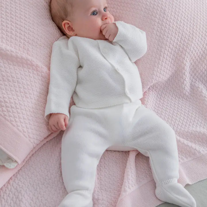 A polaina é delicadamente ajustada ao bebé com um cós elástico que se estende para cobrir os pés, mantendo-o sempre quente. Este look de malha Links não é apenas bonito, mas também prático para o dia a dia. Perfeito para qualquer ocasião, é uma escolha adorável e original para o seu pequeno.