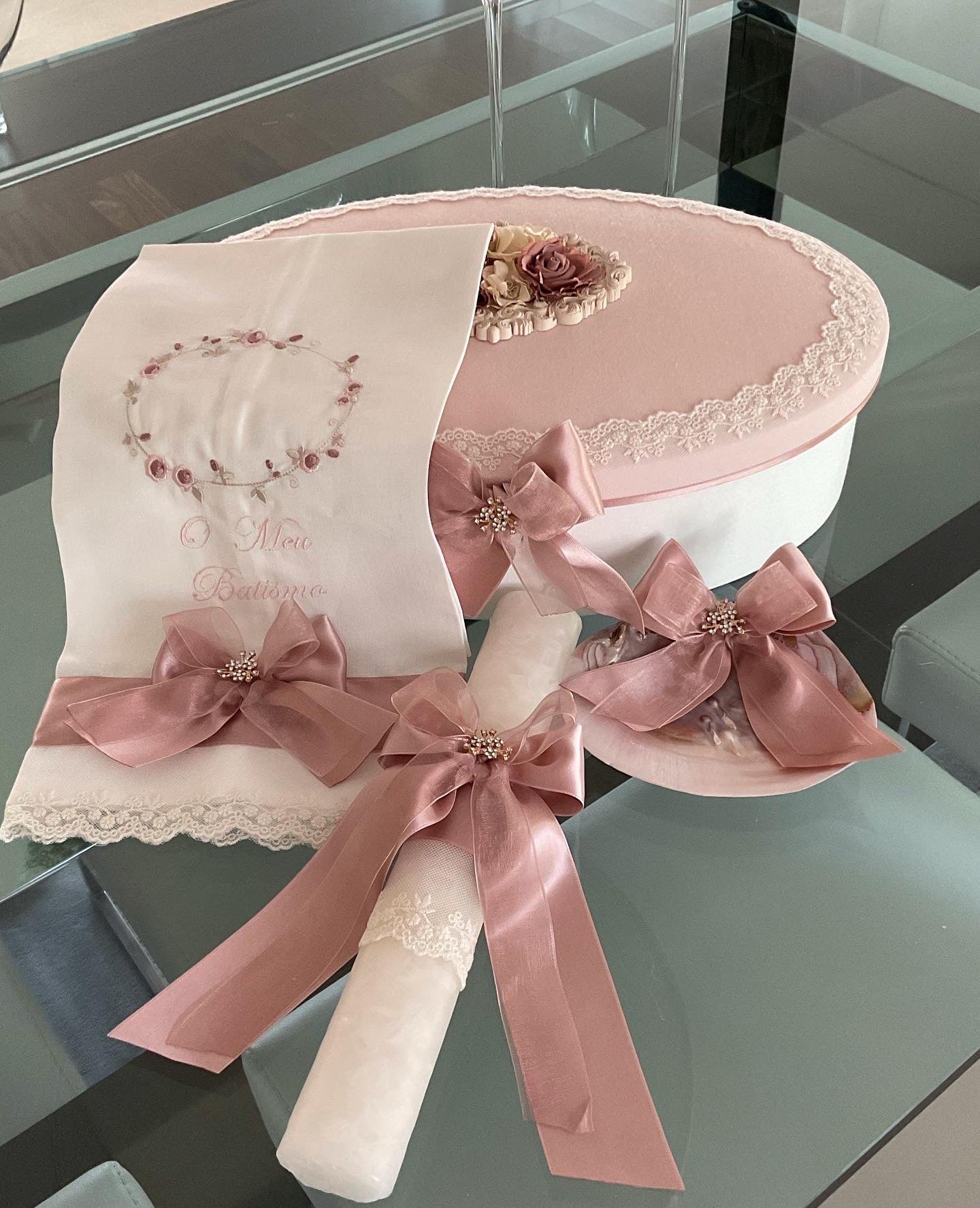 Este Conjunto Batizado é ideal para a celebração do batismo. Com uma caixa de madeira forrada a linho, renda e moldura floral vintage, uma vela artesanal marmoreada, uma toalha em linho com bordado e renda, e uma concha natural, traz elegância e sofisticação para o momento especial. Tamanho da caixa (L: 35,5 x C: 30 x A: 9 cm), vela (30 x 4,5 cm), toalha (75 x 50 cm) e concha (15 x 11 cm).