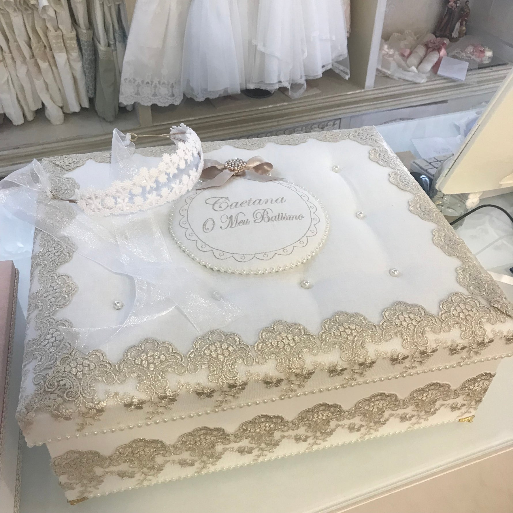 Caixa: Madeira Acolchoada Capitoné Forrada a Linho e Renda