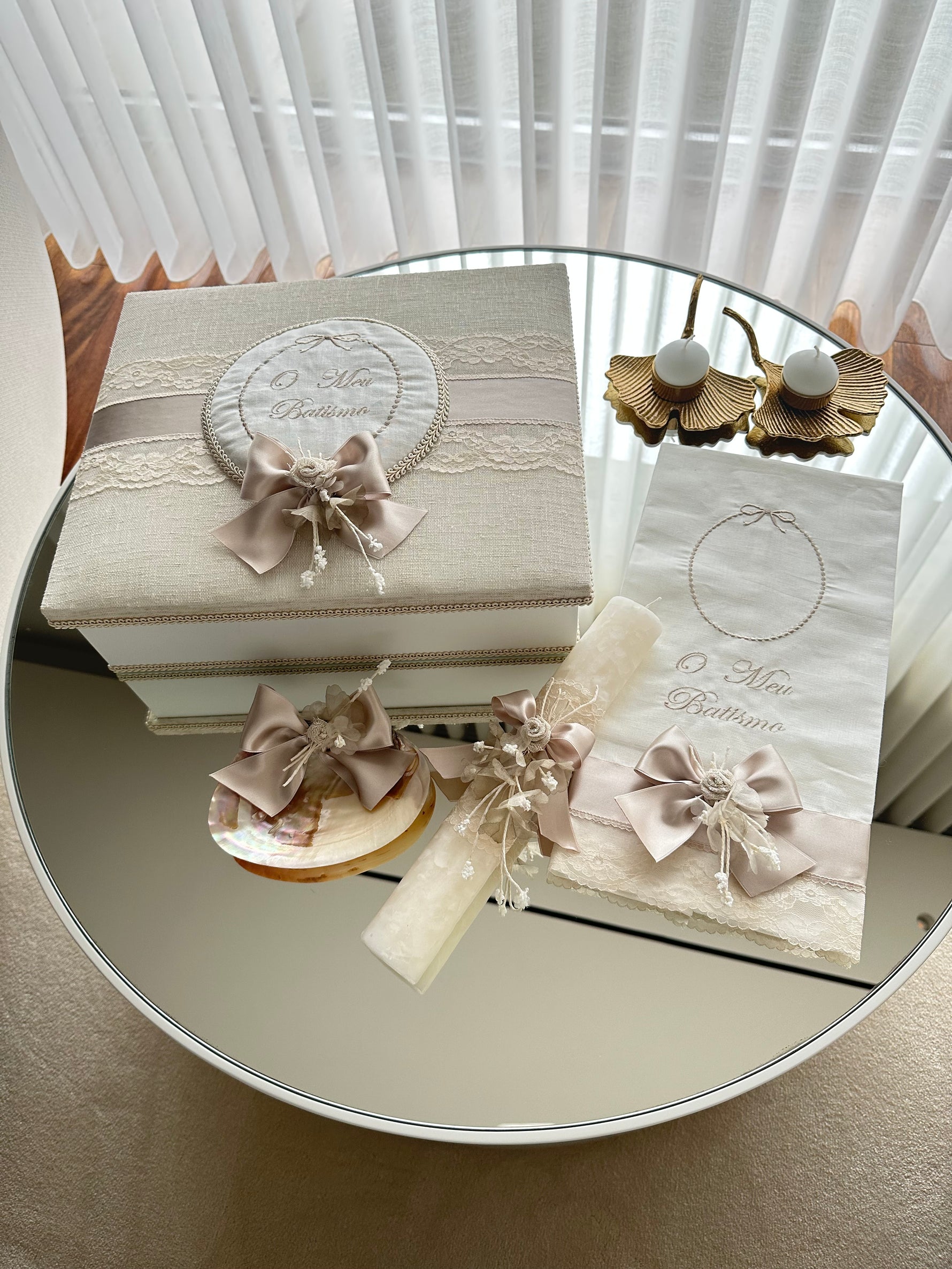 Este Conjunto Batizado é ideal para a celebração do batismo. Com uma caixa de madeira forrada a linho, uma vela artesanal marmoreada, uma toalha em linho com bordado e renda, e uma concha natural, traz elegância e sofisticação para o momento especial. Tamanho da caixa (L: 35,5 x C: 30 x A: 9 cm), vela (30 x 4,5 cm), toalha (75 x 50 cm) e concha (15 x 11 cm).