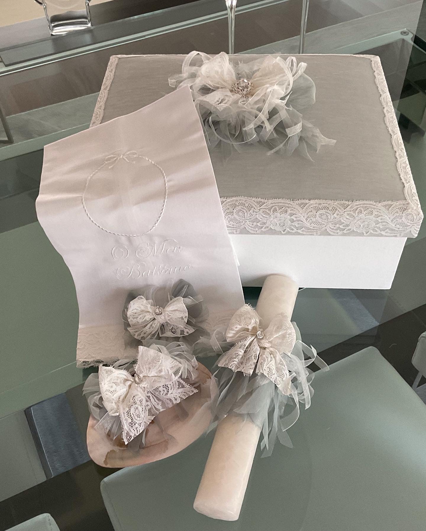 Este Conjunto Batizado é ideal para a celebração do batismo. Com uma caixa de madeira acolchoada forrada a linho, uma vela artesanal marmoreada, uma toalha em linho com bordado e renda, e uma concha natural, traz elegância e sofisticação para o momento especial. Tamanho da caixa (L: 39,5 x C: 33,5 x A: 13 cm), vela (30 x 4,5 cm), toalha (75 x 50 cm) e concha (15 x 11 cm).