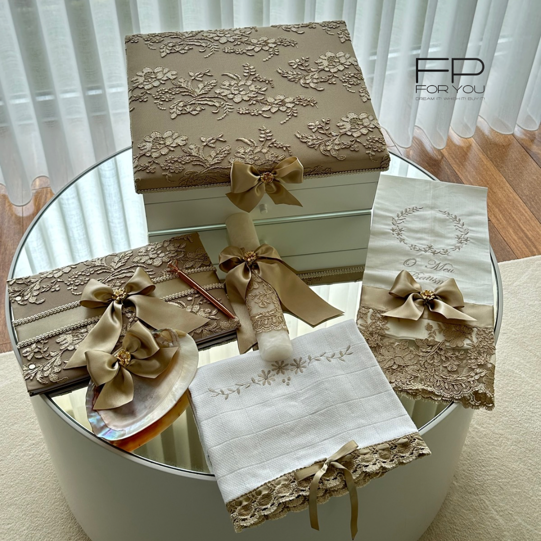 Este Conjunto Batizado é ideal para a celebração do batismo. Com uma caixa de madeira acolchoada forrada a linho, uma vela artesanal marmoreada, uma toalha em linho com bordado e renda, e uma concha natural e livro de honra com caneta traz elegância e sofisticação para o momento especial. Tamanho da caixa (L: 39,5 x C: 33,5 x A: 13 cm), vela (30 x 4,5 cm), toalha (75 x 50 cm) e concha (15 x 11 cm).