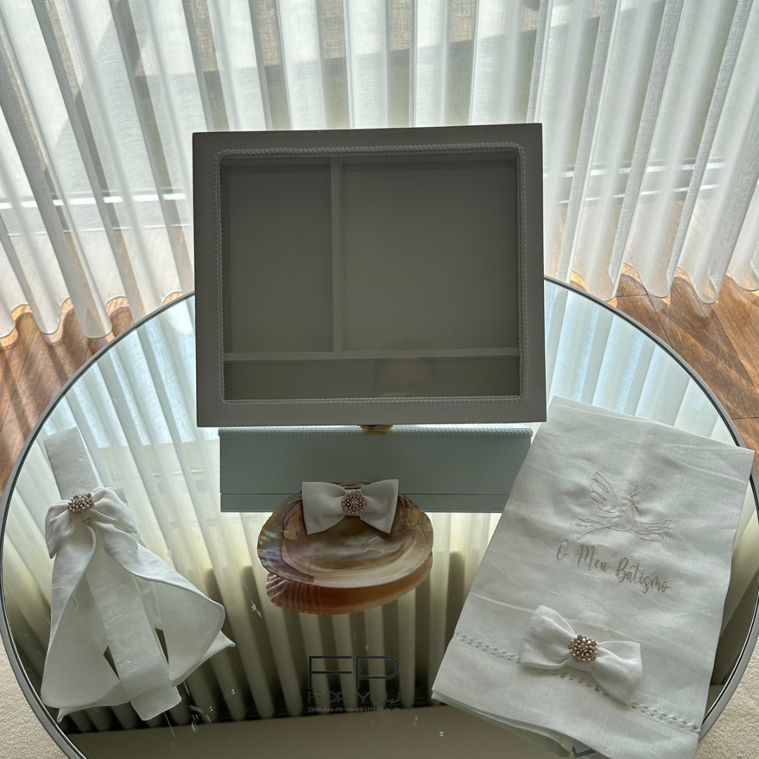 Este Conjunto Batizado é ideal para a celebração do batismo. Com uma caixa de madeira com tampa em acrílico gravada a laser, uma vela artesanal marmoreada, uma toalha em linho com bordado e renda, e uma concha natural, traz elegância e sofisticação para o momento especial. Tamanho da caixa (L: 35,5 x C: 30 x A: 9 cm), vela (30 x 4,5 cm), toalha (75 x 50 cm) e concha (15 x 11 cm).