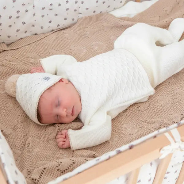 Conjunto de três peças incluindo camisola, polaina e chapéu. Uma alternativa ideal para o bebé em dias frios. Tem um design trançado muito elegante. O chapéu pompom e a trança original adicionam ternura extra. Graças aos botões traseiro, a camisola torna mais fácil para o pequeno trocar de roupa.