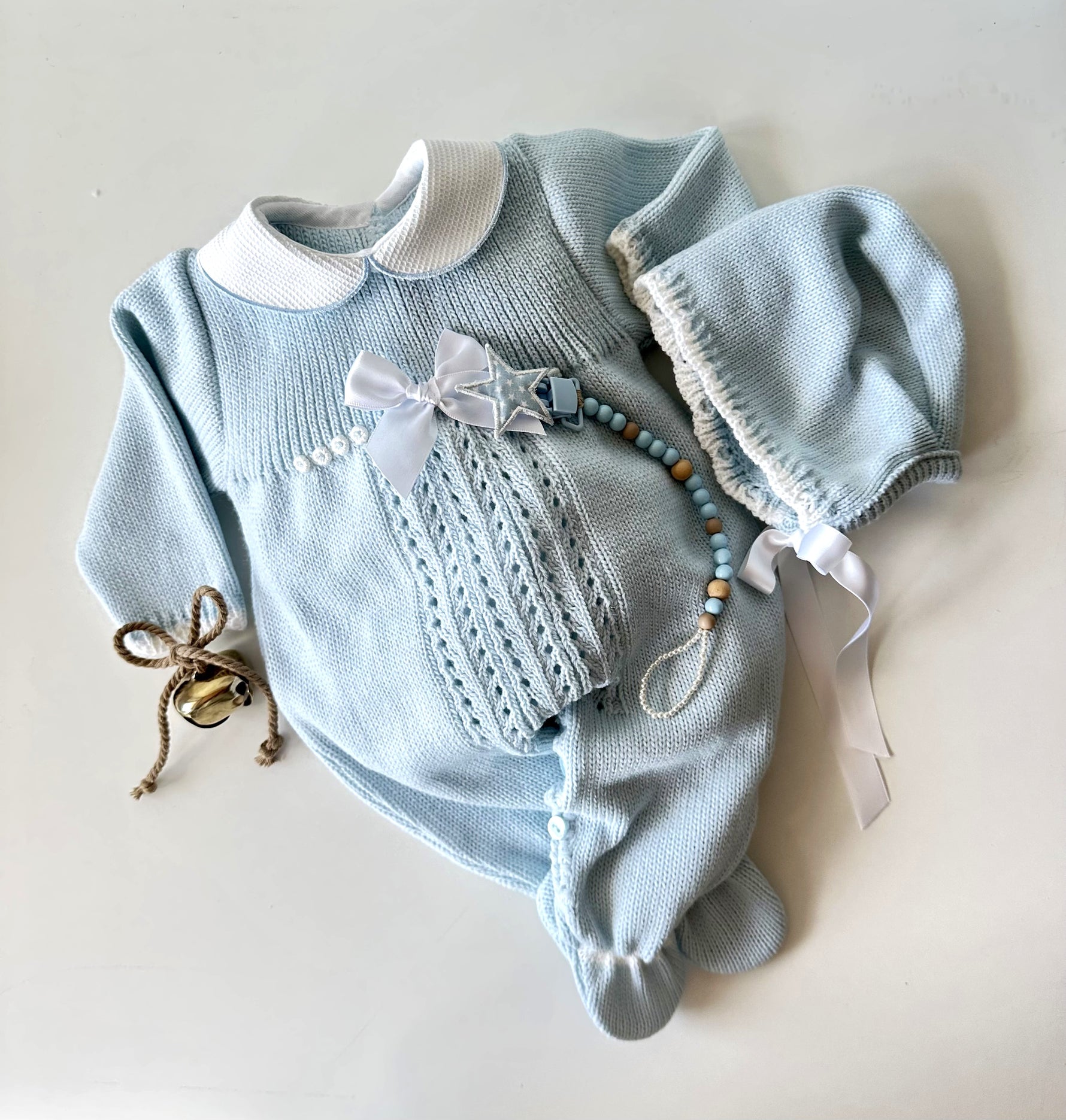 Conjunto de duas peças incluindo fato e chapéu. Uma alternativa ideal para o bebé em dias frios. Tem um design trançado muito elegante. O desenho original adicionam ternura extra. Graças aos botões traseiro, a camisola torna mais fácil para o pequeno trocar de roupa.
