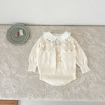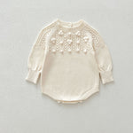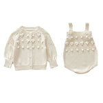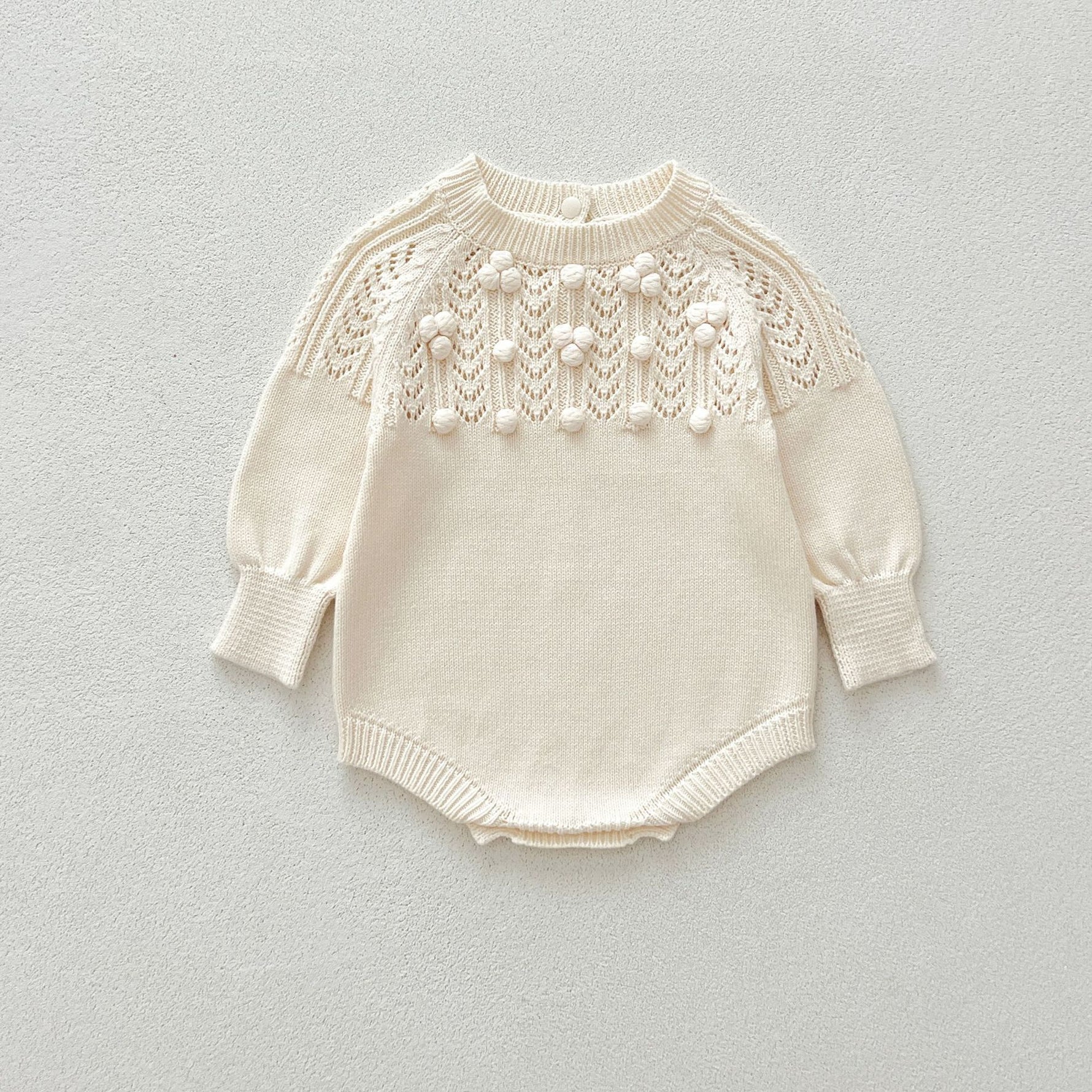 Este conjunto de malha feito à mão, com gola redonda e bolinhas aplicadas, é ideal para manter a sua bebé confortável e elegante. Confecionado em algodão macio, oferece respirabilidade e suavidade, perfeito para o uso diário em estações como inverno, primavera e outono.