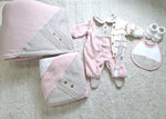 1 Babygrow + 1 Manta Saco + 1 Fralda + Casaco Riscas + Prendedor de Chupetas + Babete + Toalha de Banho